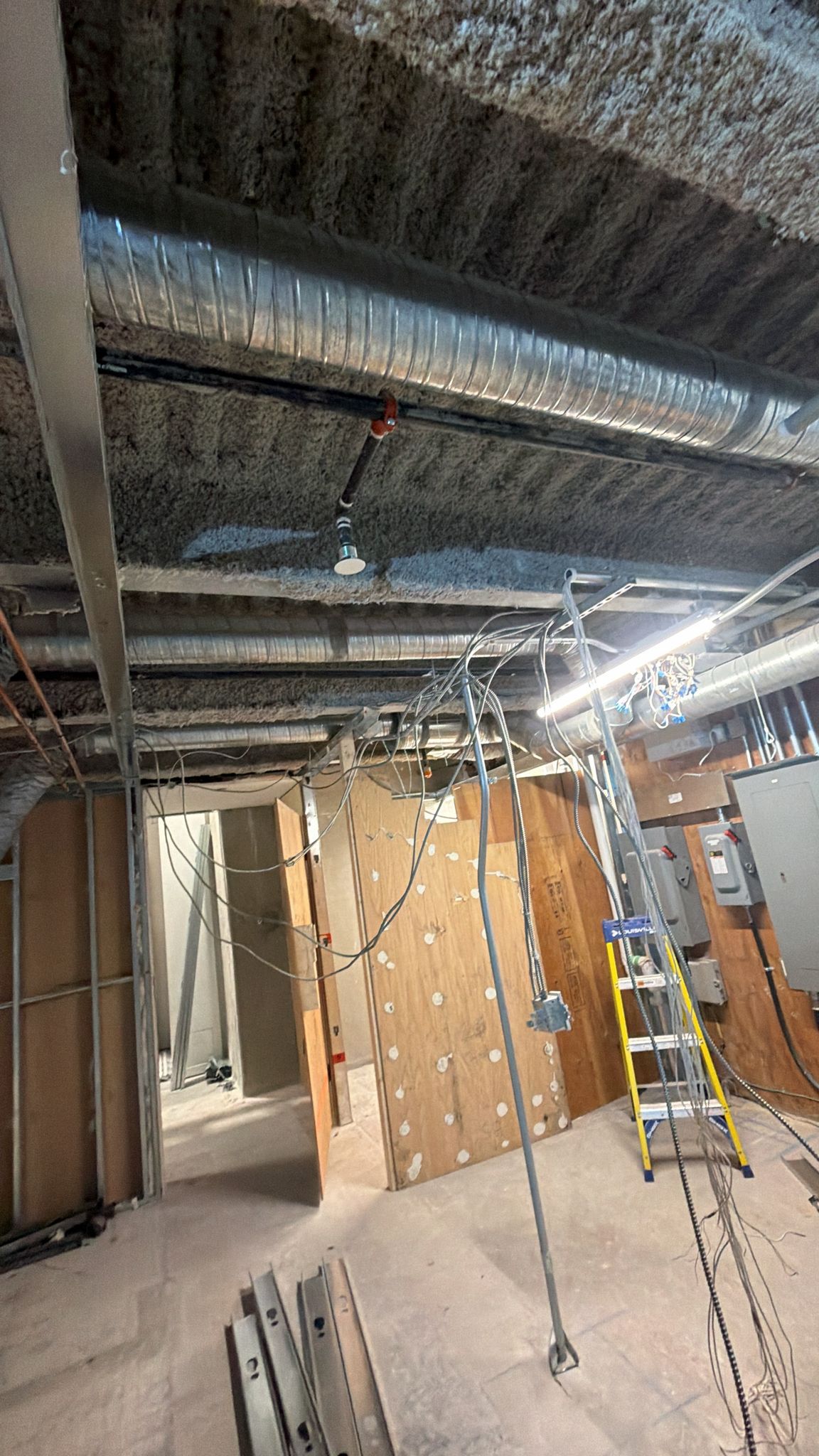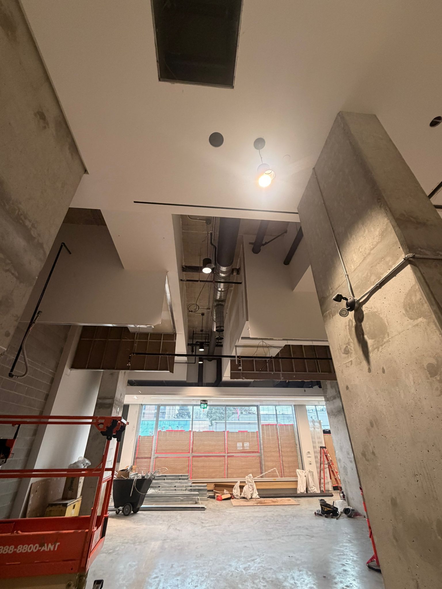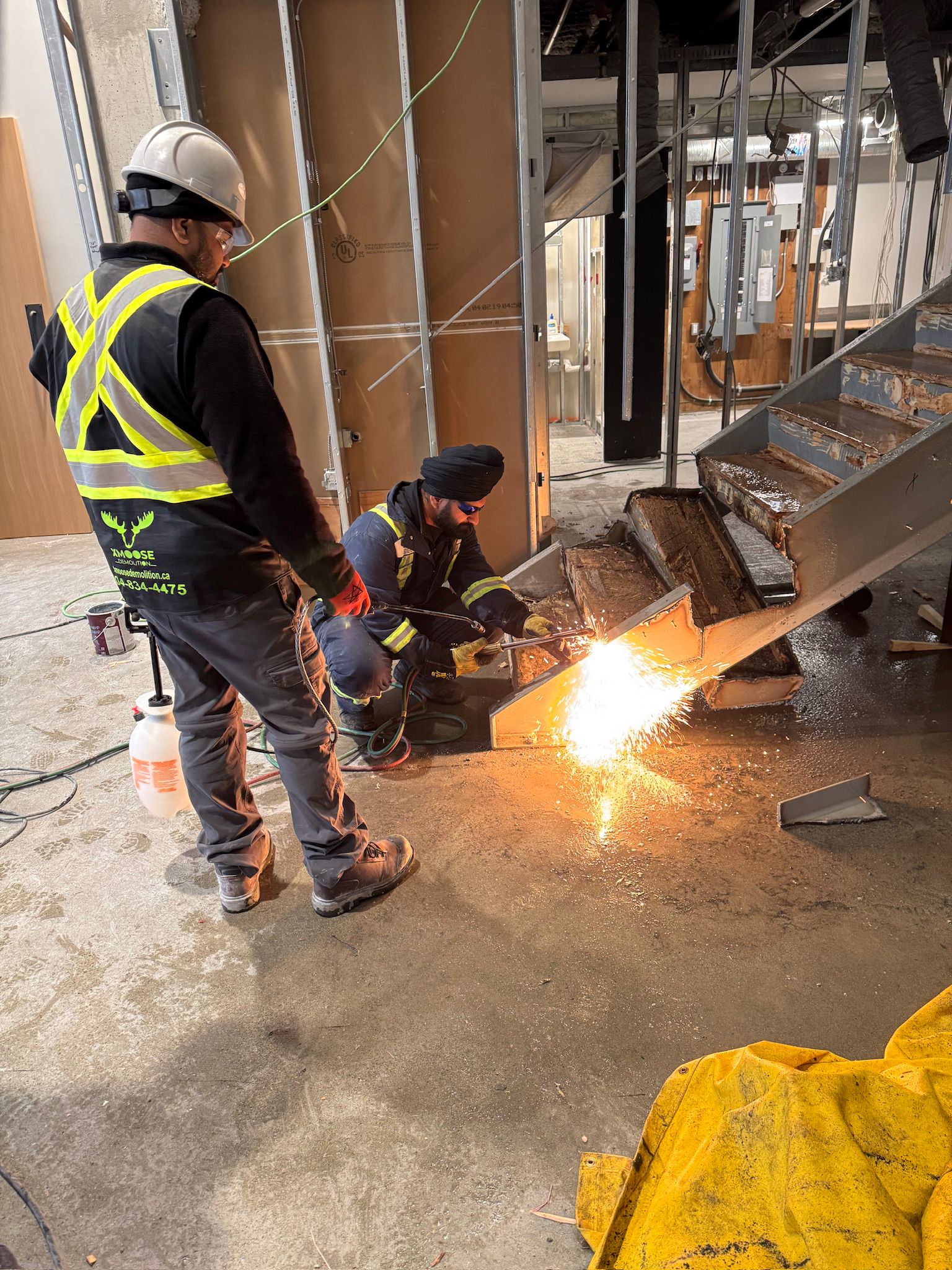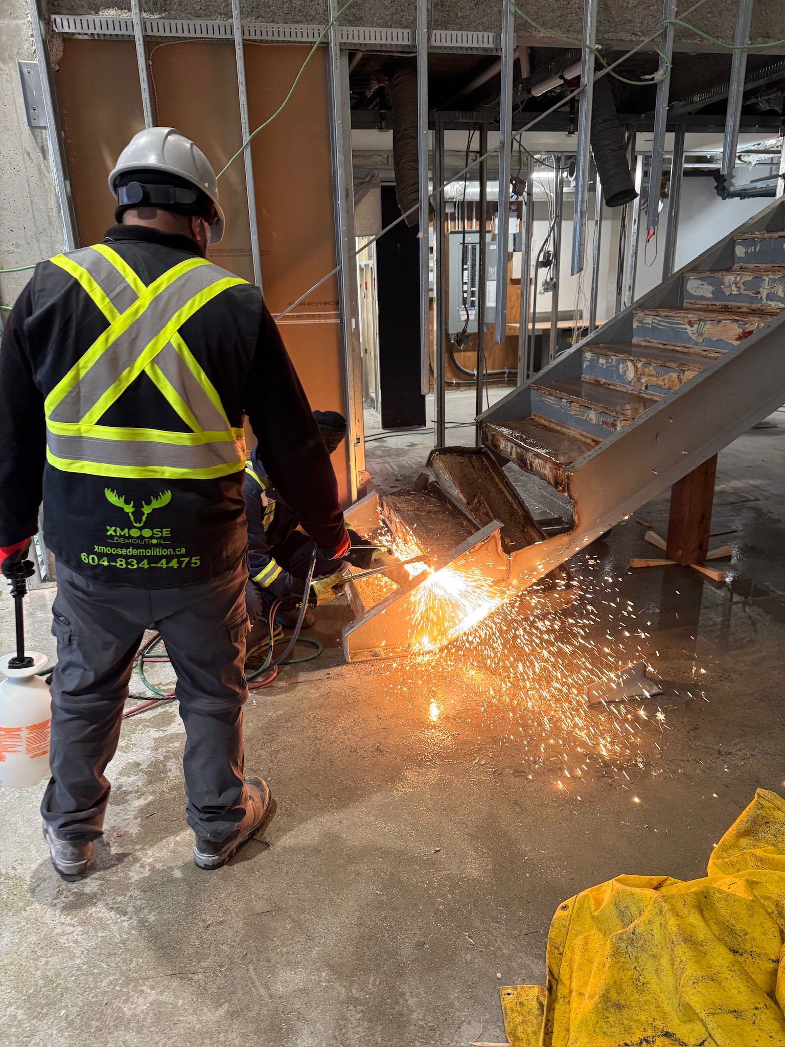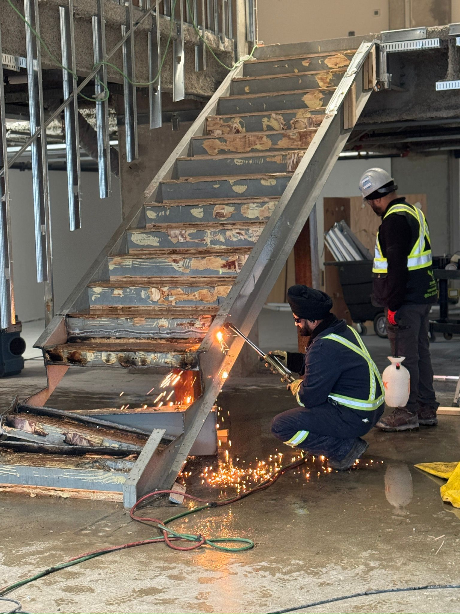 This project involved a variety of demolition scopes, including removal of CMU (concrete block) walls, multiple flooring systems, high-rise ceiling assemblies, wall panels, railings, and a structural metal stair system. The metal stair was carefully dismantled using controlled gas cutting methods to ensure safety and precision.